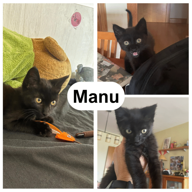 Manu vive en otra casa de acogida, pero tiene la misma energía y dulzura que sus hermanos. Con dos meses de vida, ya se ha convertido en un experto en robar corazones con sus juegos, ronroneos y ganas de compañía. Está vacunado, desparasitado y preparado para conocer a su familia definitiva. Si buscas un compañero divertido y afectuoso, Manu puede ser el ideal.